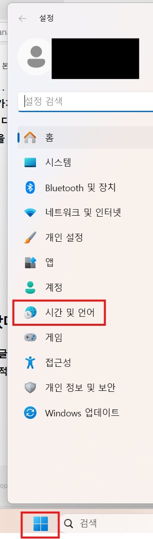 1. 시작 버튼을 누르고 설정에 들어가 시간 및 언어를 클릭....