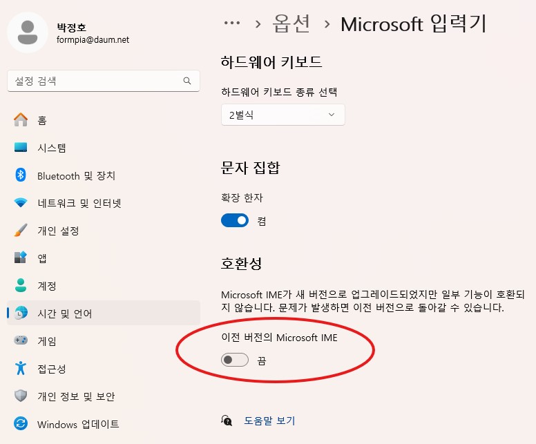 5. 이전 버전의 Microsoft IME이 끔으로 되어 있는 것을 켬으로 키시라.