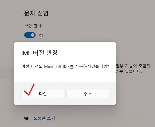 6. 끔을 활성 시킴과 동시에 IME 버전 변경 창이 뜬다. 당연히 확인을 누르시고 컴을 재부팅해서 엑셀이든, 메모장이든 등등에서 한글이 속시원하게 잘 입력되는 것을 볼 수 있다.